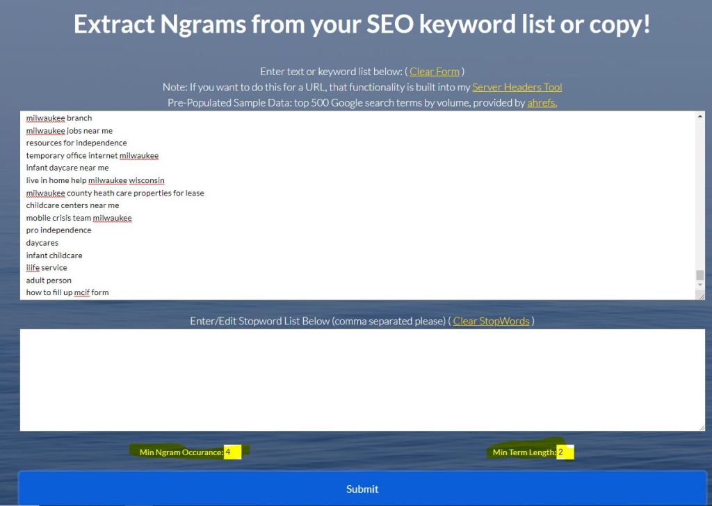 Change the settings at the above to 4 for Min Ngram Occurance and 2 for Min Term Length. Click “submit.”