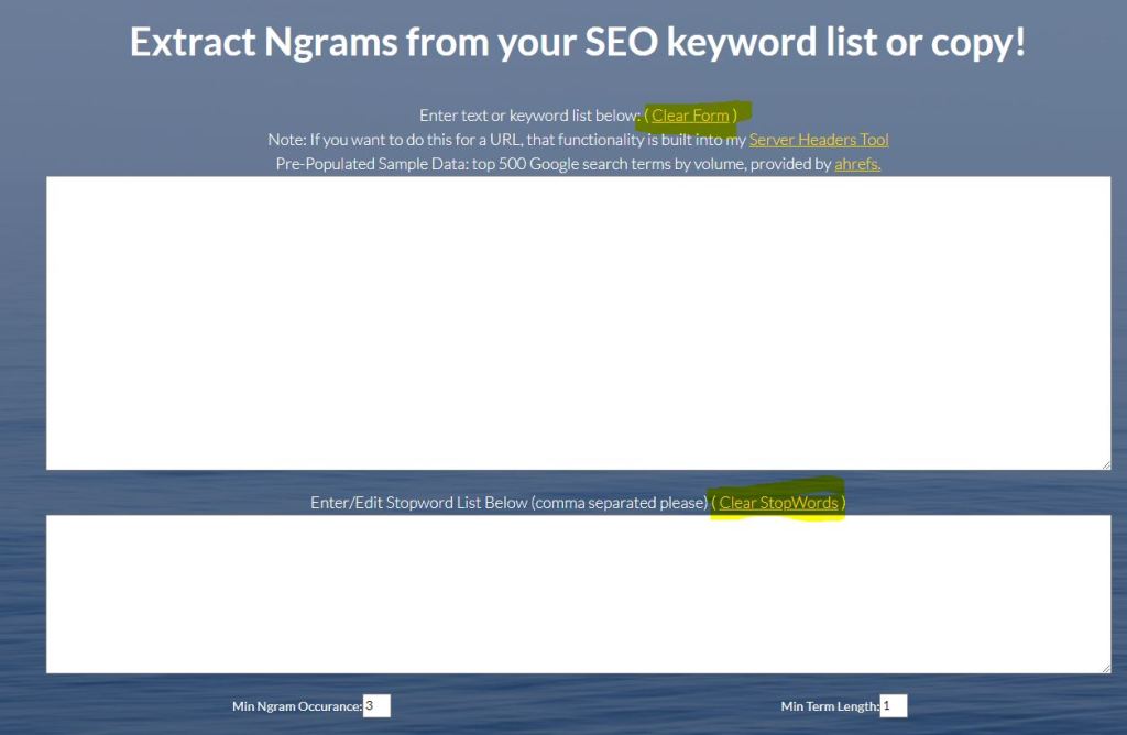 Then open the Ngram website: https://seodataviz.com/ngram.php#